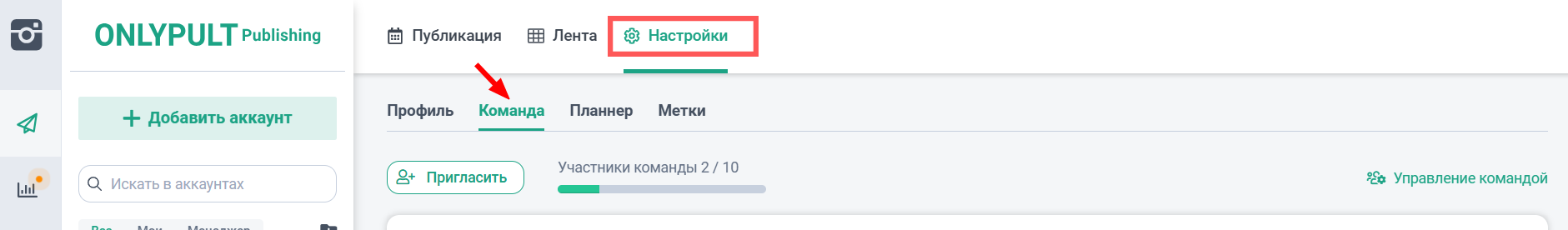 Для того чтобы предоставить доступ к проектам, выберите нужный аккаунт и перейдите в раздел Настройки/Команда: