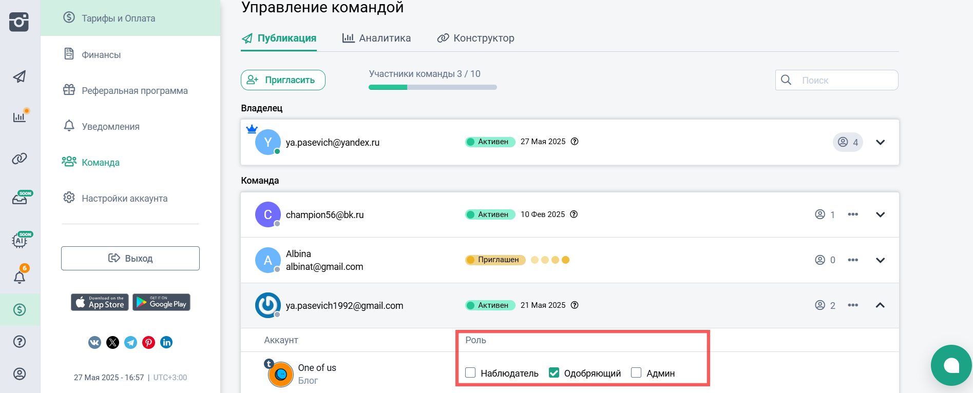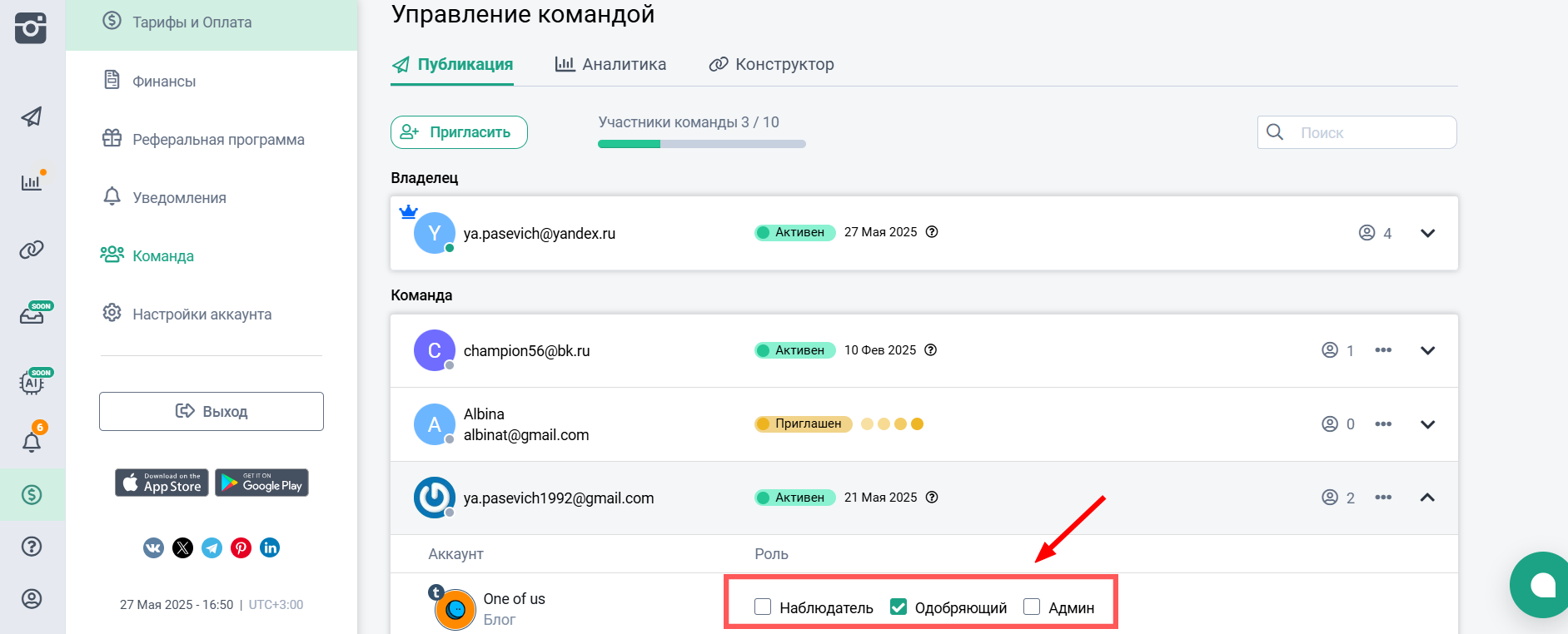 В этом разделе вы можете пригласить коллег и клиентов для сотрудничества, назначать им различные роли и предоставлять доступ к необходимым инструментам, таким как Публикации, Аналитика и Конструктор.