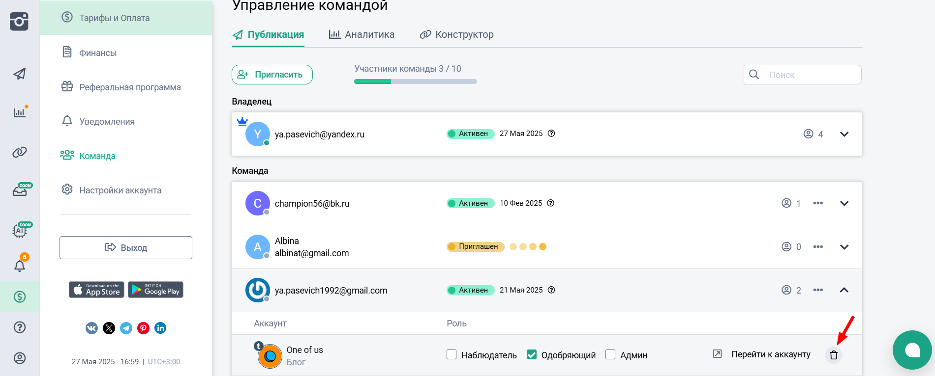 Чтобы удалить доступ, нужно нажать на “Корзину” в правой части строки, чтобы участник больше не имел доступа к аккаунту: