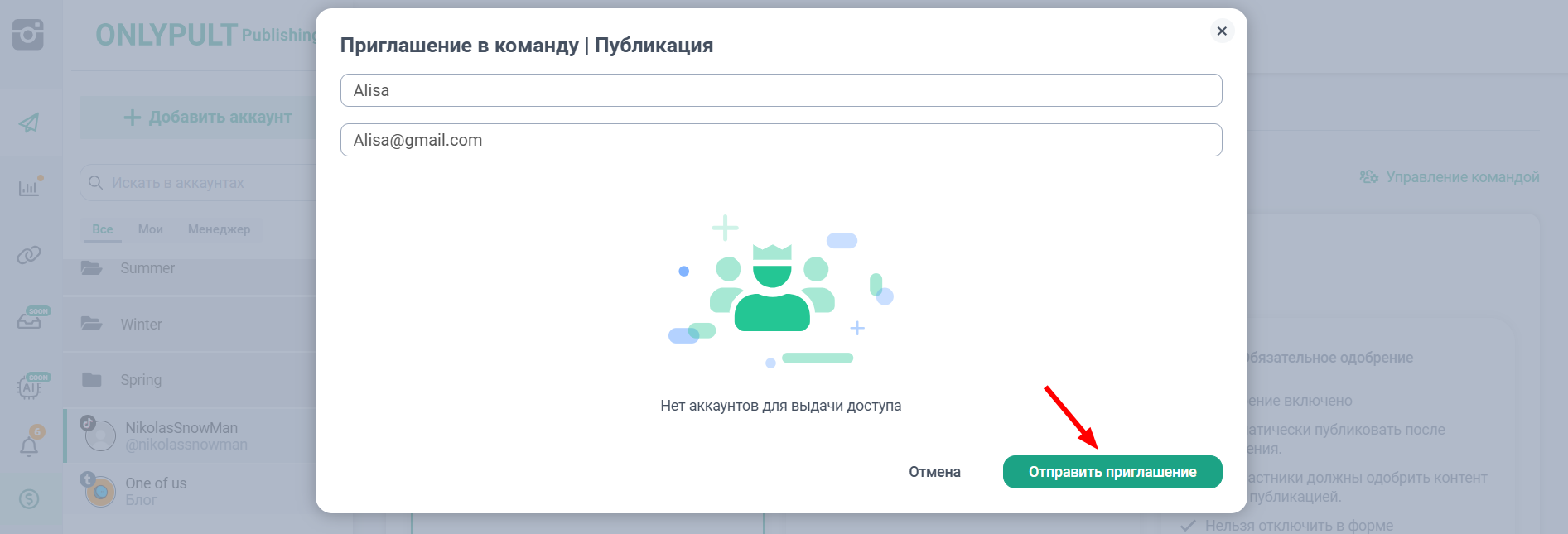 Раздел Команда создан для упрощения совместной работы на платформе Onlypult.