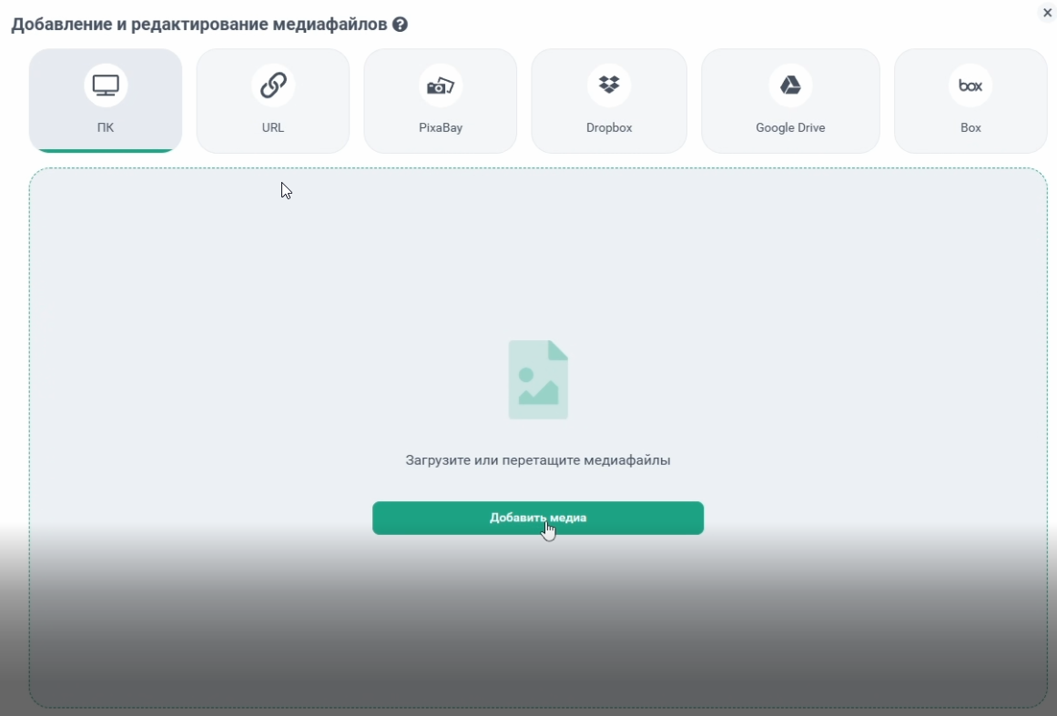 - Нажмите на кнопку “Добавить медиа”, чтобы открыть редактор фото/видео файлов.