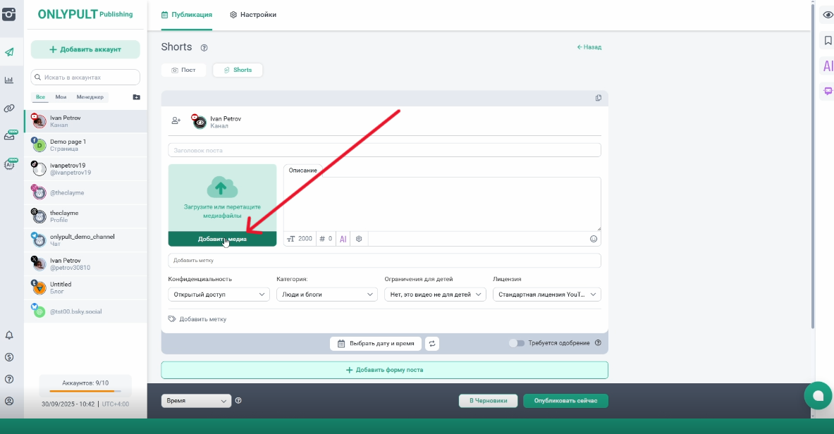 - После добавления всего необходимого настройте время публикации или нажмите “Опубликовать сейчас” или “Добавить в черновики”.